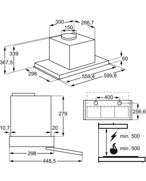 Potência de exaustão, nível máximo/mínimo: 600 m3/h / 250 m3/h m³/h