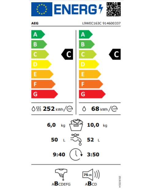 Classe de eficiência de secagem por centrifugação do programa eco 40-60 (UE 2017/1369): B