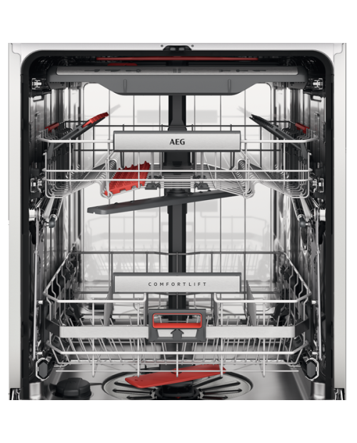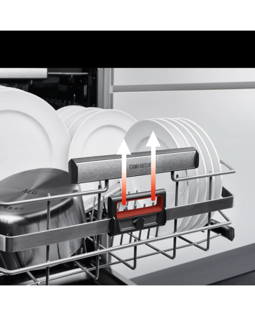 Cesto superior: 2 prateleiras rebatíveis, 2 prateleiras rebatíveis para copos, 2 Soft Splikes, 6 Soft grips para copos de vinho, Suporte rebatível para chávenas, Pega sem inox AEG, Pegas laterais