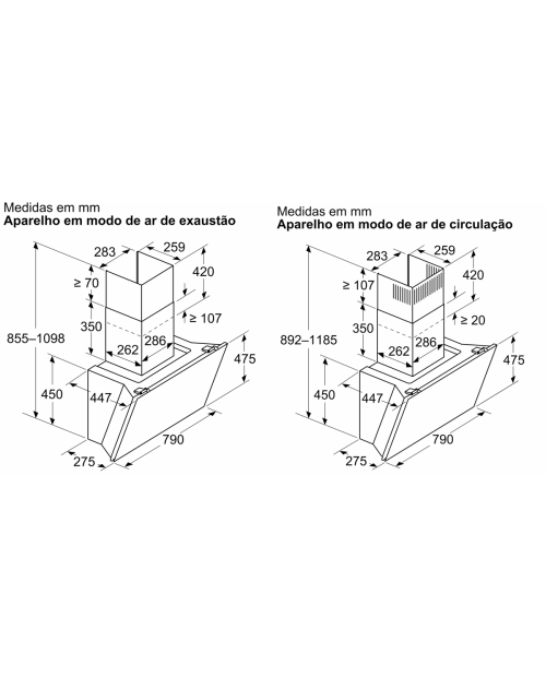 Medidas do aparelho em modo de saída de ar (AxLxP): 855-1098 x 790 x 447 mm