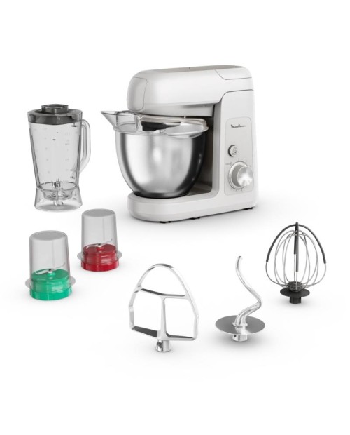 Potência: 1100W· Kit Pastelaria incluído: gancho, batedor e batedor de arames· Movimento planetário· 8 velocidades + função pulse· Capacidade da taça: 4,6L· Taça em inox com proteção anti-salpicos· Material do corpo em plástico· Acessórios: liquidificadora de 1,25L, trituradora, picadora