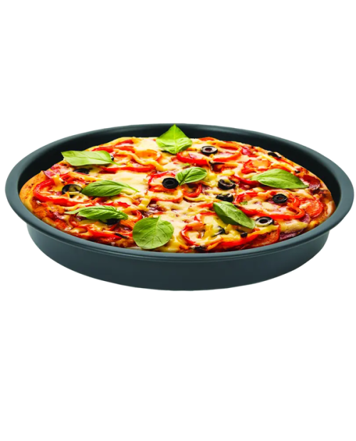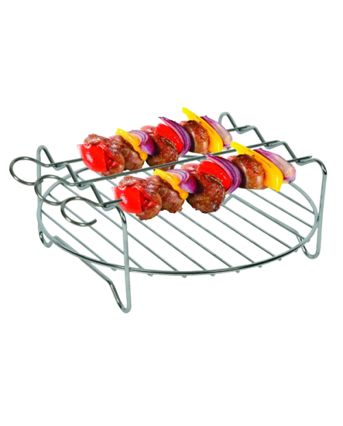 4 acessórios: forma de bolos, placa de pizza, grelhados com espetos e suporte em metal