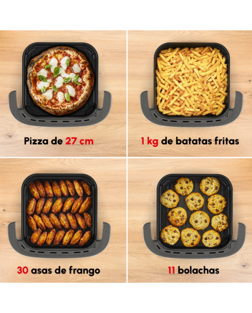 Multifunções: Air fry; Grelhar; Assar; Sobremesa; Tostar; Desidratar; Reaquecer; Função descongelar