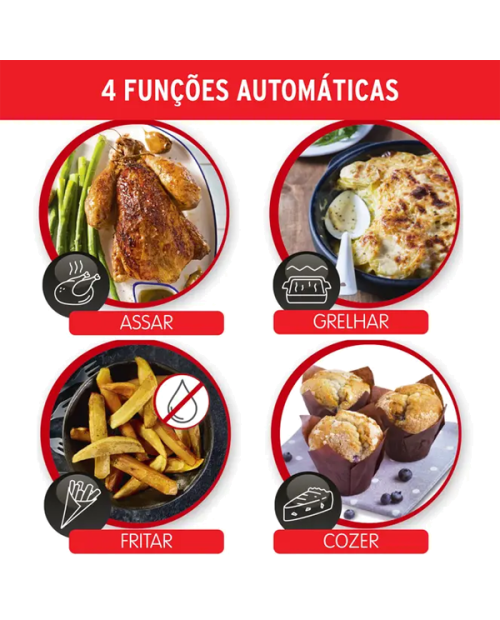 4 funções automáticas para resultados estaladiços: assar, grelhar, fritar e cozer