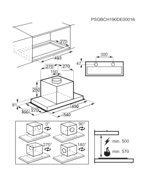 Potência de exaustão, nível máximo/mínimo: 580 / 300 m³/h