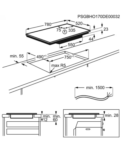 Funções: Indicador de calor residual em três passos, Alarme acústico, Aquecimento automático, Função PowerBoost, Segurança de crianças, Temporizador, Temporizador Eco, Função Hob2Hood, Bloqueio de painel, Função ponte, Aviso por minutos, Função Pausa, Desativar som, Temporizador