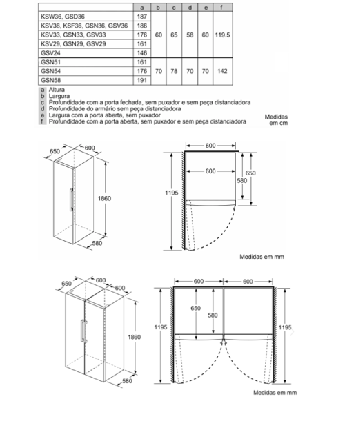 Aparelho (A x L x P sem puxador): 186 x 60 x 65 cm INFORMAÇÃO TÉCNICA