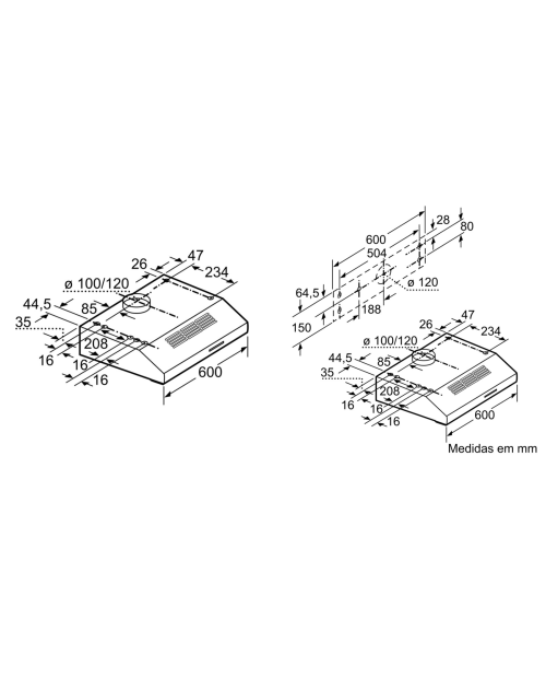 Diâmetro das condutas Ø 120 mm ou Ø 100 mm