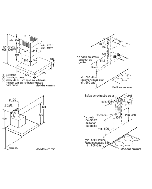Medidas do aparelho em saída de ar (AxLxP): 628-954 x 898 x 500 mm
