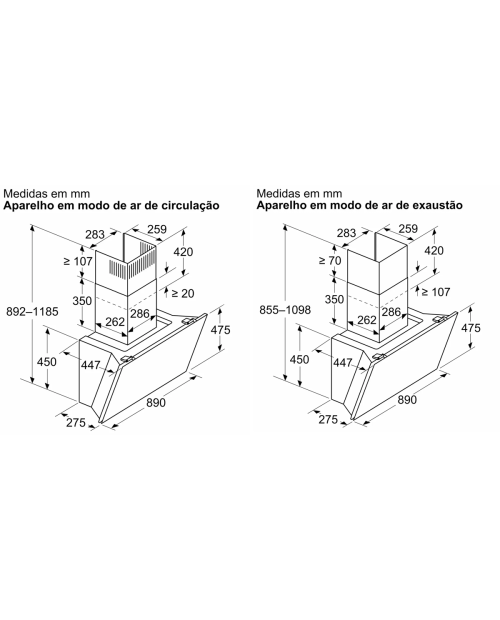 Medidas do aparelho com o módulo de recirculação de ar (AxLxP): 892-1185 x 890 x 447 mm