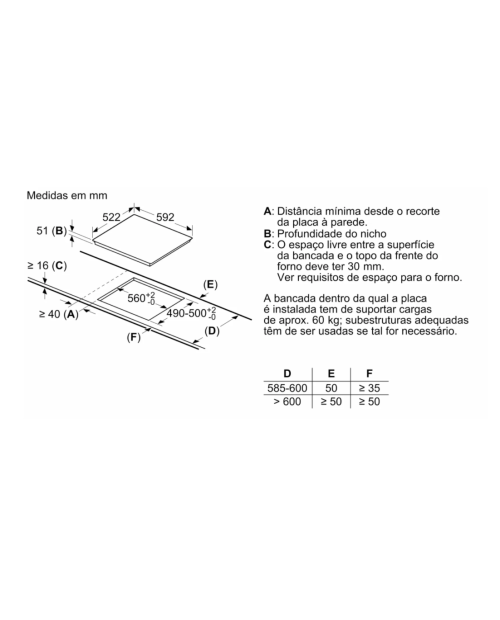 Dimensões do nicho para a instalação (AxLxP mm) : 51 x 560 x (490 - 500)