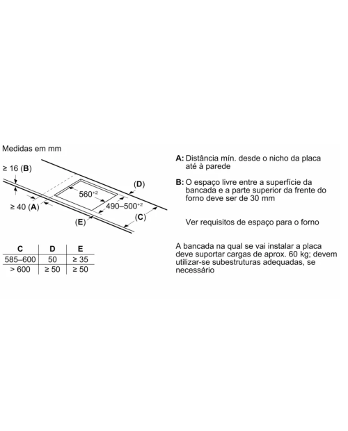 Dimensões do nicho para a instalação (AxLxP mm) : 51 x 560 x (490 - 500)