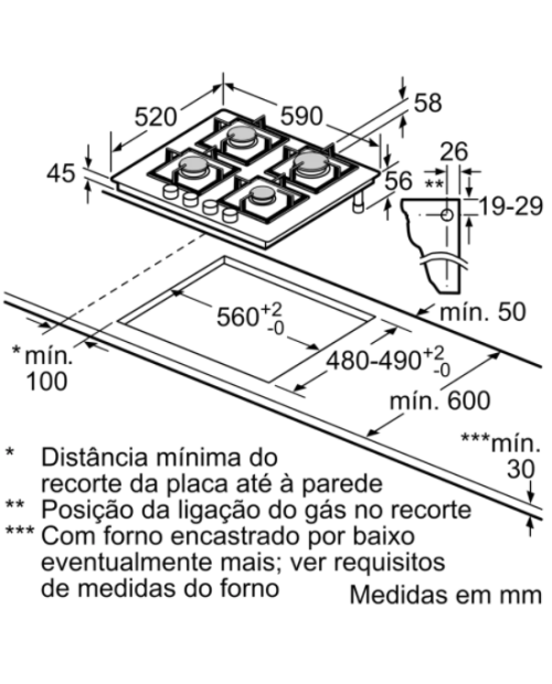 Preparada para gás natural (20 mbar) - No caso de pretender a instalação de outros tipos de gás, por favor verificar se os indutores estão incluídos (ver Acessórios). Se não estiverem incluídos, por favor contacte os serviços técnicos. MEDIDAS (mm):