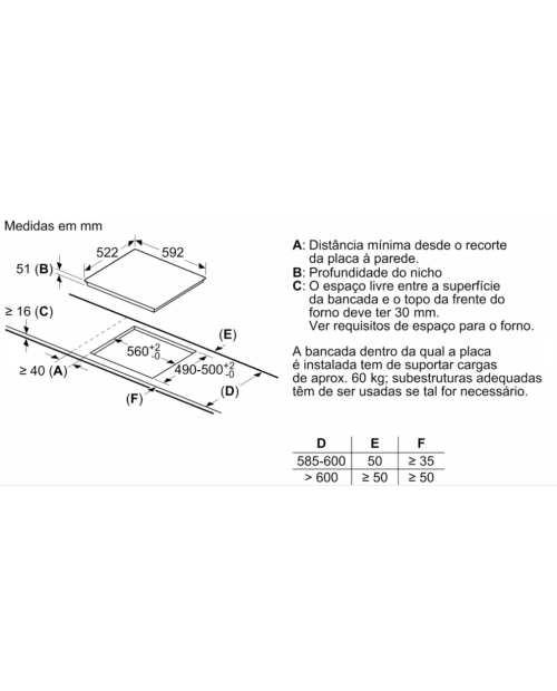 Dimensões do nicho para a instalação (AxLxP mm) : 51 x 560 x (490 - 500)