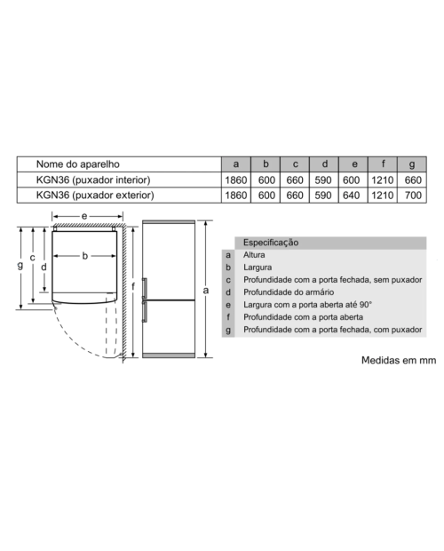 Aparelho (A x L x P sem puxador): 186 x 60 x 66 cm INFORMAÇÃO TÉCNICA