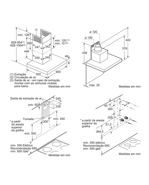 Medidas do aparelho em saída de ar (AxLxP): 628-954 x 898 x 500 mm