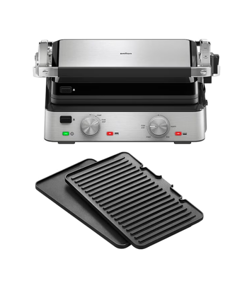 Conjunto de 1 placa ondulada e 1 placa lisa em alumínio, antiderentes e removíveis. Regulação independente da temperatura de cada placa através de 2 controlos mecânicos.