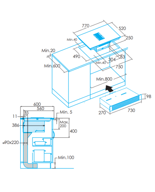 Potência de extração Máx / Mín: 542 / 199m³/h
