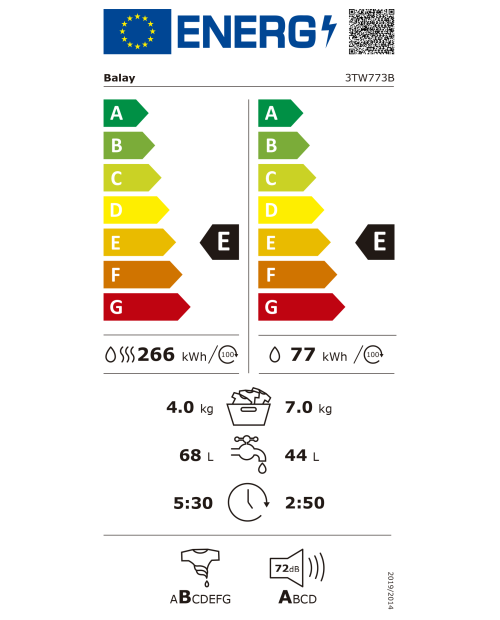 Classe de eficiência energética para o cíclo completo E (numa escala de classes de eficiencia energética de A a G)