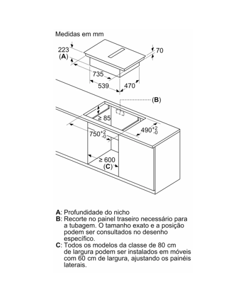 Dimensões do nicho para a instalação (AxLxP mm) : 223 x 750 x (490 - 490)