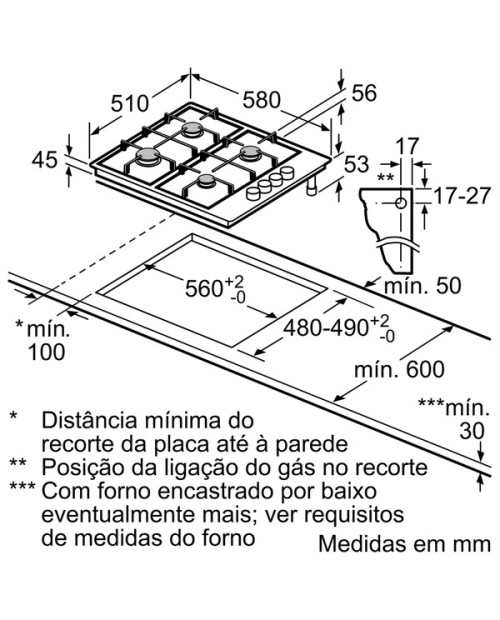 Potência das zonas (valores máximos, dependendo do tipo de gás): 1 x 1.0 KW, 1 x 3.0 KW, 2 x 1.7 KW