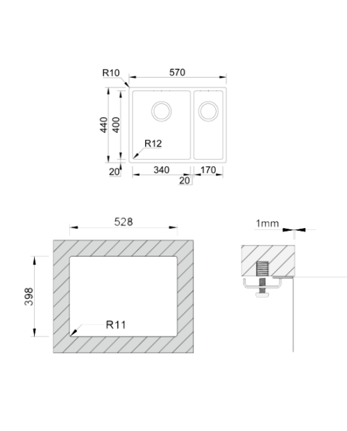 Medida das cubas: 340x400/170x400mm