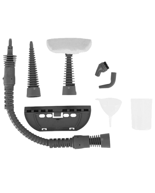 9 acessórios: Tubo flexível, bico cônico, acessório para superfícies lisas, acessório para vidro, pano, escova redonda, bico inclinado, funil e copo medidor.