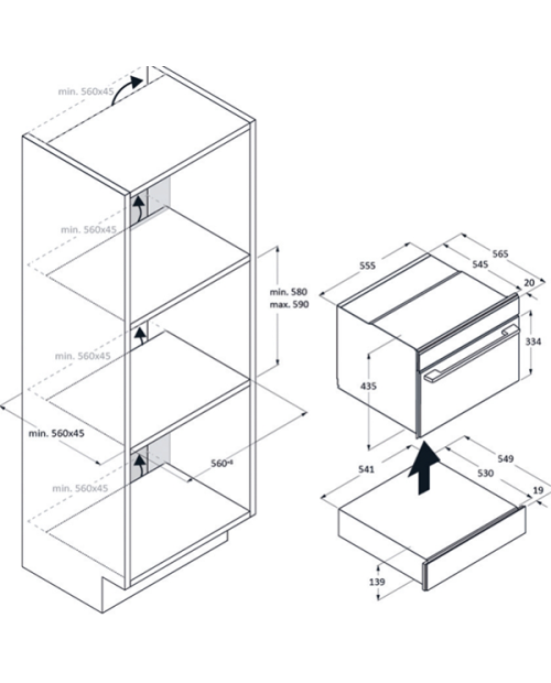 Dimensões necessárias para o encastre AxLxP: 142x556/564x550 mm