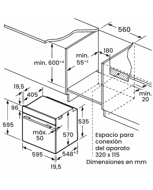 Dimensões de encastre: 57x56x54,8cm